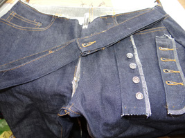 インシームにマチを入れてはばを出します。この場合はマチに使用するデニムが必要になります。穿かなくなったジーンズを部材取りジーンズとして同梱してください。部材取りをするジーンズは無い場合は弊社手持ちのデニム生地を使用します。デニムに色目は異なりますが、内側にて補正をしますので、あまり目立ちません。仕上がり画像を参考にして下さい。