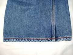 | 裾の仕上げに加工が施してある為に丈詰めをためらっておられる場合ご相談下さい。 全てでは有りませんが、”あたり”部分を利用して、裾上げをするお直しもあります。 特殊裾上げ”あたり再利用”からご注文下さい。お直し料金は¥4,400(税込)です。 逆チェーンステッチでの仕上げも同じ料金です。 |