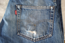 現状ポケットの周りのステッチを一度全て外します。 (ポケット口のステッチは外しません。ダメージ部分のたたき補修完了後ポケットを元位置に縫い直します。